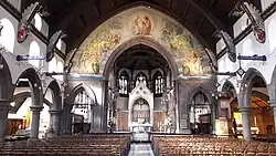 The war memorial and high altar were added in 1921, designed by Reginald Fairlie. A baldachino was added in 1927.[4] In 1932, the height of the roof was increased by Reid and Forbes.[6]