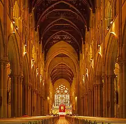 In cross-section the cathedral is typical of most large churches in having a high central nave and an aisle on either side, which serve to buttress the nave and provide passage around the interior. The interior of the nave thus rises in three stages, the arcade, the gallery and the clerestory which has windows to light the nave. See cathedral diagram The building is of golden-coloured sandstone which has weathered externally to golden-brown. The roof is of red cedar, that of the nave being of an open arch-braced construction enlivened by decorative pierced carvings. The chancel is vaulted with timber, which was probably intended to be richly decorated in red, blue and gold after the manner of the wooden roof at Peterborough, but this did not eventuate, and the warm colour of the timber contrasts well with the stonework.