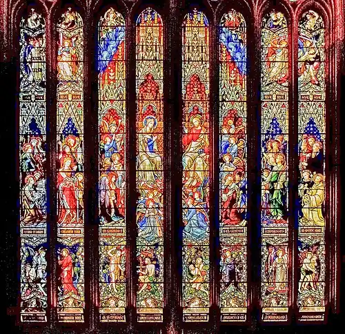 Despite the many English features of the architecture including its interior and chancel termination, the entrance façade is not English at all. It is a design loosely based on the most famous of all Gothic west fronts, that of Notre Dame de Paris with its balance of vertical and horizontal features, its three huge portals and its central rose window. There are two more large rose windows, one in each of the transepts. The French façade was, however, intended to have twin stone spires like those of Lichfield Cathedral, but they were not to be put in place until 132 years after the building was commenced.