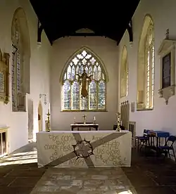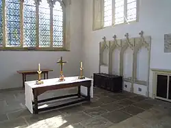 The North porch and the aisle windows were added in the 15th century; the North porch is single storey and retains its original door arch and windows, while the two-storey 14th-century South porch has many of its original features with a gabled front that was restored in the 19th century. The North aisle is dedicated to St James.[4] The nave is of five bays, and the chancel retains its mid-14th-century sedilia. The original rood screen dividing the chancel from the nave was probably destroyed during the English Reformation. Today in its place is a modern cross above the altar of The Risen Christ by John Mills, President of the Royal Society of British Sculptors and who lives nearby in Hinxworth Place.[2]