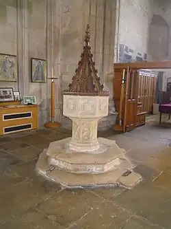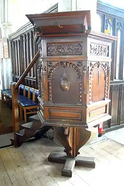 The hexagonal wooden pulpit is dated 1627 while the church has a 15th-century traceried wooden screen to the Lady Chapel in the East bay of the South aisle. The baptismal font is a 19th-century replica but stands on an early octagonal base. There are 15th-century benches near the chancel.[4]