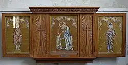 The embroideries displayed around the church include the reredos behind the altar in the Lady Chapel showing The Virgin and Child flanked by St James and St John the Baptist are by Percy Sheldrick (1890–1979) of Ashwell who worked as a master weaver and embroiderer at William Morris' Morris & Co. workshops at Merton Abbey Mills during the 1920s. His greatest work was 'The Passing of Venus' from a design by Pre-Raphaelite Brotherhood artist Edward Burne-Jones and which includes 18 life-size figures; it is now in Lansing Community College in Michigan. He left Merton Abbey Mills in 1939 and returned to Ashwell to work for an antique dealer. There, he acted as Verger at St Mary's. Sheldrick continued to embroider in his spare time and his work can be found in collections and institutions all round the world.[2]