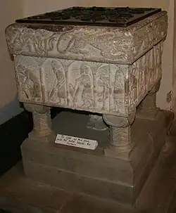 - ^ The Labours of the Months depicted on the font are: January, drinking; February, keeping warm; March, digging; April, pruning; May, either beating the bounds or the Risen Christ;, June, weeding; July, mowing; August, binding a sheaf; September, threshing; October, milling; November, slaughtering a pig; December, feasting.[7]