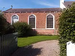 The building is constructed of light red brick, with bracketed eaves, and a Welsh slate roof with stone gable coping. There is a single storey, and along the side are three windows with a roll-moulded surrounds and Tudor arched heads, and a sill band. The porch is to the southwest. Inside the church is Gothick decoration and fittings, a gallery at the west end, and box pews. The plasterwork is particularly rich, and is believed to have originally been painted in bright colours, and to have been created by Italian craftworkers.[1][2][3]