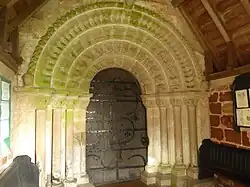 The church is constructed in red and yellow sandstone with a tiled roof. The plan consists of a nave and chancel in one cell, a south porch, a northeast vestry, and a bellcote on the west gable.[2] The church has retained many Norman features, including three doorways. The south doorway is the most elaborate, with four orders of shafts and leaf capitals. It is decorated with chevrons and crenellation. The north doorway is simpler, with a single shaft. Its decoration includes crocus blossom, leaf scroll and geometrical motifs. Both of the doors in these doorways date from the late 12th century, and they have retained their original ironwork. The priest's doorway in the chancel has one order of shafts, with dog-tooth decoration and geometrical motifs. In the north wall of the church are two Norman windows.