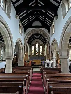 The church is built of sandstone, with a Welsh slate roof. It has a three-bay nave and a two-bay chancel, with a south aisle and north chapel. At the west end is a three-stage tower, which includes a three-light Perpendicular window in the second stage, two windows in the belfry, and a battlement. Most of the windows in the body of the church are 19th century, although there is a moved 13th century lancet window in the north chapel. In the porch is a 12th-century capital, which has been reused as a stoup. The font is 13th century and has an octagonal bowl. There are three bells, cast by John Warner in 1889, and the organ was designed by Abbott and Smith in 1913.[1][2][3]
