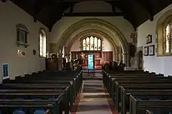 Inside, there is a bowl font dating from around 1100, brought from a demolished church in Egton. It has an elaborate timber cover, constructed in 1903. There is a 12th-century altar slab, probably from the hermitage chapel, and a grave slab dating from 1695. The pulpit is 17th century, while the choir fittings are by Brierely, and other fittings including the altar and reredos are by Robert Thompson.[3] The stained glass in the east and south windows is from the early 20th century, while the west windows have stained glass inserted to celebrate the Millennium.[1]