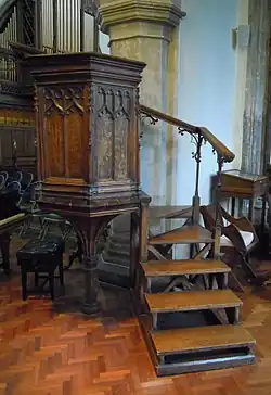 Features surviving from the 15th century and of particular note are the baptismal font, which dates from about 1470 and around the base of which the figures of the Twelve Apostles were damaged by Puritan soldiers during the English Civil War when Oliver Cromwell garrisoned his troops in the church; the pulpit dates from about 1500 and no longer has its canopy, its ‘wine-glass‘ base or its clerk's desk.[6]