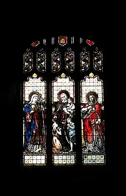 The stone pulpit and font are late Victorian; the only stained glass window is a 3-light west window from 1888 by Jane Nelson, in memory of her husband Matthew, depicting the Virtues of Faith, Charity and Hope.[1][2] There are two sets of Hannoverian coats of arms, one painted and one wooden.[1]