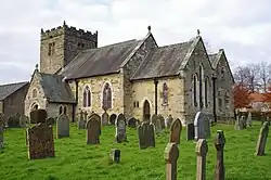 The church is built of stone with Welsh slate roofs, and consists of a nave, a north aisle, a south porch, a north vestry, a chancel with a north chapel, and a west tower. The tower has a chamfered plinth, quoins, diagonal buttresses, a west window, two-light bell openings, and an embattled parapet with crocketed corner finials. The porch has a sundial in the gable, and the inner doorway has a round arch with three orders of chevrons on columns with decorated cushion capitals. Inside, there are two 13th-century grave slabs, pews which are probably 17th century, and a bell with the date 1684.[1][2]