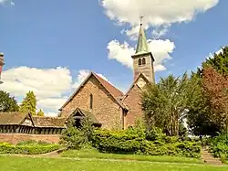 St Mary's Church lies immediately to the south of the house at Kyre Park, and is joined to the house by a cloister built in the 19th century.[3] The church is built of sandstone rubble, with ashlar dressing. The nave and chancel date from the 12th century; the chancel is not quite in line with the nave and inclines to the north. There is a south chapel, added in the early 14th century, when the roofs were replaced and buttresses were added to the eastern angles.[2][4]