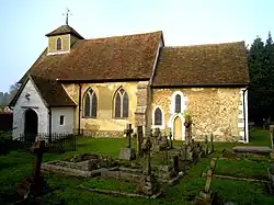The church is the oldest building in the area and is only 60 feet long inside. Mentioned in the Domesday Book of 1086, parts of the building date to the 11th century and is built on the remains of an older Saxon structure. However, most of what is seen today dates to the late 12th century and was reroofed in the 15th century when the south porch was also added. The nave has three bays and a chancel. The church has a pyramidical timber-framed bell-cot with a tiled roof at the west end inside which is a bell dating to the 14th century. The exterior is of flint and ironstone random rubble, partly rendered, with freestone dressings and ashlar, brick and tile buttresses. The windows in the nave have a Y tracery. The gabled porch has a square headed doorway with shields in spandrels. Inside there is a carved effigy of the Crusader Sir Richard de Montfichet on a window sill. His heart is reputedly buried under the church.[1][3][4][5]