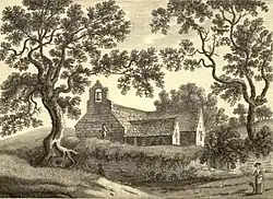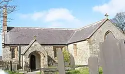 The church is built from irregularly positioned pieces of rubble masonry, and Kennedy added red sandstone dressings in his 1882 work.[2] The nave measures 50 feet 3 inches long by 17 feet 3 inches wide (about 15.3 by 5.3 m); the chancel is the same width, and about 7 feet (2.1 m) long. The chapel is 17 feet by 20 feet 6 inches (about 5.2 by 6.25 m).[9] There is medieval masonry in three of the walls: the west wall, and the lower parts of the north and south walls.[2] The roof is made of slate, with a stone bellcote containing one bell at the west end.[2][10] Inside, the wooden trusses of the roof are visible.[2] The trusses were re-used when the roof was reconstructed.[9] The church is entered through a porch on the south side, added in the 19th century, and a Tudor arch doorway; the porch contains a stone piscina (a water basin), said to be part of a font dating from the 12th century. An old entrance in the north wall of the nave has been blocked up. Two of the three windows in the north wall are from the 19th century. The third, nearest to the east end, is from the early 17th century and has a square frame.[2][9] The eight-sided font also dates from the 19th century.[2] The 1937 survey by the Royal Commission on Ancient and Historical Monuments in Wales and Monmouthshire also recorded the existence of an oak poor box, with iron straps, bearing the date of 1740, and a plain silver cup from about 1685.[9]