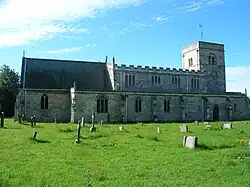 The church's most noted feature is the south doorway, built in the 1150s and reset twice, most recently in the 15th century. It has three orders of arches and its voussoirs are decorated with a variety of Biblical, mythological and everyday scenes.[3] Some designs have been held to have a Viking influence.[4] Inside, there are remains of a brass dedicated to Maud and Robert Kelsey, dating from about 1500, two Baroque wall tablets, and a coat of arms of George III, painted in 1792. There is also a 17th-century communion rail.[1][2]