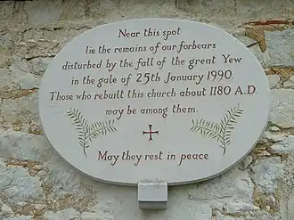 A yew tree stands on the left-hand side of the path leading to the south porch. It was planted about 600 A.D., and in Gilbert White's time its girth was 23 feet (7.0 m). In The Natural History and Antiquities of Selborne it is included among the village's antiquities. It was blown down in a storm on 25 January 1990; the trunk was replanted, but it was declared dead in 1991. A cutting from the tree is growing in the churchyard.[2][3][6] The Selborne Yew was selected in 2002 by the Tree Council as one of the 50 Great British Trees marking the Golden Jubilee of Elizabeth II.[5][7]