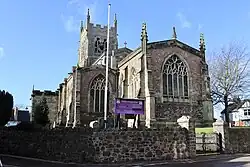 The church dates from the 13th to 15th centuries, but was heavily restored and underpinned between 1878 and 1880[3] at a cost of £5,300 (equivalent to £666,400 in 2023).[4] Decayed foundations were replaced by a solid base of 2 ft of Portland cement and granite chips. Arches and windows which had previously been bricked up were opened out again. A new roof was installed, reusing as much of the medieval carved oak as possible. Mr. Goodwin of the Lugwardine Works, Hereford provided encaustic tiles to pave the chancel. Mr Powell of Whitefriars carved a new reredos for the high altar. The old high backed pews were removed ready for new seating. The three entrances were supplied with new oak doors, and a new floor was laid in the belfry. The work was carried out to the designs and supervision of the architect Arthur Blomfield.