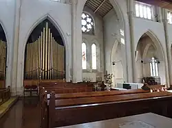 The main body of the church is seven bays in length: four for the nave, two for the chancel and one for the crossing.[19] The roof is open to the rafters here, braced on massive arches which spring from slender columns on the nave arcade. The north and south transepts are slightly lower in height than the nave and chancel, and are formed of one bay each. Beyond the crossing, the Seafarers' Chapel occupies the end of the north chancel aisle, whilst the organ occupies the south chancel aisle.[19] The Seafarers' Chapel commemorates the seafaring history of the port of Southampton, decorated with a nautical theme; at the entrance to the chapel are hung the house flags of many of the shipping companies that used the port and a ship's binnacle serves as a lectern.[19]
