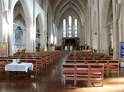 Unlike the exterior, which retains several features of Street's church, the interior mostly reflects Craze's post-war rebuilding. The interior is lofty and spacious, but relatively plain, with high, bare arches spanning the interior. Entering the church through the main entrance below the west window, the conical baptistery is on the left, the only internal part of the church, other than the tower, to survive unaltered from before the bombing. The tower vestibule is on the right, lit by two large Geometrical windows above which is a stone quadripartite vault. The baptistery also contains a quadripartite vault, painted in blue and gold.[18]