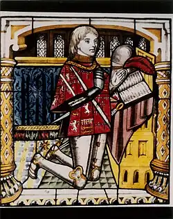 Contemporary depiction of John Howard at prayer from stained glass window, south chapel, St. Mary’s Church. Image believed to have been reproduced (c.1500) in a painting at Tendring Hall, Norfolk, both now lost [6] (see image, right).