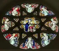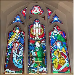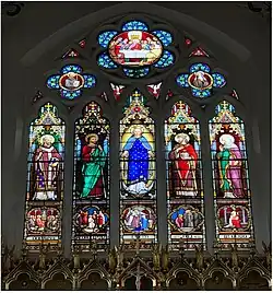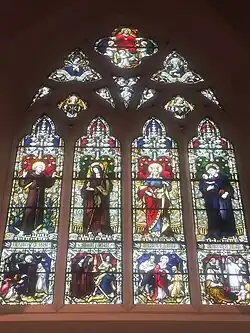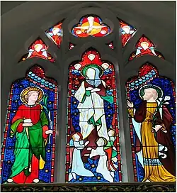 Inside the church, the high altar and reredos date from 1865, and were probably designed by E. W. Pugin. They were separated in 1948–50 by Weightman and Bullen, who placed the reredos against the east wall. The stained glass in the east window dates from 1878, and is a typical design by the Belgian stained glass painter Jean-Baptiste Capronnier.[3] The two-manual pipe organ was built by Franklin Lloyd in 1895, and is situated in a gallery on the north wall of the church at the west end.[9]