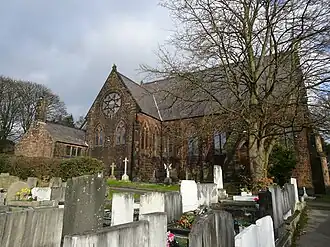 St Mary's is constructed in red sandstone and has a slate roof. It is orientated with the ritual east facing the northwest.[a] The plan consists of a five-bay nave with a north porch but without aisles, large north and south transepts, a chancel with north and south chapels and sacristies. There is no tower. At the west end are diagonal buttresses, an entrance, and pointed windows containing Geometric tracery.[2][3] The windows along the sides of the nave have two lights. In the south transept is a four-light window, and the north transept contains two two-light windows with a rose window above. In the chapel is a five-light window flanked by diagonal buttresses. The chapels are gabled with two-light windows. The south sacristy has one and two lights, with a rose window in the gable.[2]