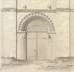 Grimm also provides a detailed drawing of the main entrance showing the orders of the arch studded with flowers and dogtooth ornament and two heads on the door jamb, one of which is a bishop. Above this is a running frieze with two heads above.