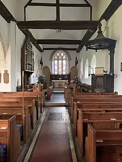 The interior of the church features timber beams, a carved wooden pulpit, and memorials to local families. There are several interesting brass and stone monuments, some dating back to the 16th century.