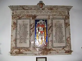 The church continued to expand as the congregation grew. A west gallery for choristers was inserted in 1670—an early example of the practice, common in Sussex, of building accommodation for a choir at the west end of a church so the congregation could face them when they sang. Organs were sometimes too expensive for churches to buy, so choral music by local singers was often preferred instead. West-end galleries only became prevalent in Sussex churches in the early 18th century, though.[13] A porch was built on the south side in 1718, enclosing the Saxon/Norman doorway;[14] and as part of a Victorian restoration, the capacity was increased in 1853 when the nave was extended with a north aisle.[6][10] A clock was added to the tower in 1898 to commemorate Queen Victoria's Diamond Jubilee.[1] A vestry was added in 1912, and general work was carried out in the nave and chancel during the 1930s.[5] A modern stained glass window by prolific Sussex-based firm Cox & Barnard was inserted in the south aisle in 1982; it depicts a rural scene.[15][16]