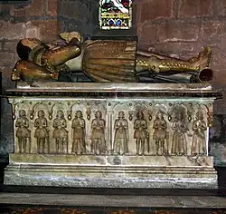 Some of the most church's notable memorials include four alabaster altar tombs, which are located within the chancel. All four are dedicated to members of the Giffard family. Of those four, the oldest tomb is that of Sir John Giffard (d. 1556)[7] and his two wives, Jane (Hoord) and Elizabeth (Greysley); the second oldest tomb is that of Sir Thomas Giffard (d. 1560) and his two wives, Dorothy (Montgomery) and Ursula (Throckmorton); the third is dedicated to Sir John Giffard (d. 1612) and his wife Joyce (Leveson); and the fourth to Walter Giffard (d. 1632) and his wife, Philippa (White).[1][2][3][4][6][5]