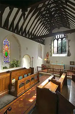 The plan of the church consists of a nave with a north porch, a south aisle, a north transept, and a chancel.[3][9] The walls are of flint with small areas of rendering, and are in good structural condition.[2] Although very thick, the window openings are splayed to allow more light in.[4] At the west end of the church is a "pretty" weatherboarded bellcote with a shingled broach spire.[3][5][9] The chancel is Norman, with two original round-headed windows, a carved triangular string-course and traces of a round-headed south doorway.[2][8][9] The nave windows are in Decorated Gothic style, and the east window is Perpendicular Gothic. There is evidence of blank arcading around some of the windows—a feature also seen at St Michael and All Angels Church in nearby Little Horsted.[5] The high chancel arch, inserted by Paley and Austin, is in 13th-century (Early English Gothic) style.[2][5][8] There is also a king post roof.[5]