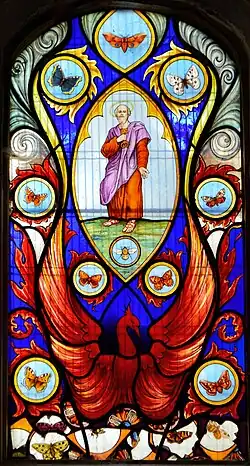 During the 13th century a north chapel or transept was added towards the east end of the nave, and a two-bay south aisle was built.[8][9] The aisle had the appearance of a transept and was separated from the body of the church by a two-bay arcade.[3][10] In the following century the nave was rebuilt.[2] The north porch was added, and the east window was inserted, during the 15th century.[8][10] Around the same time, diagonal buttresses were added at the east end—possibly because the insertion of new windows in the chancel had weakened the walls.[4][10] In 1882–83 the church was restored by the Lancaster architects Paley and Austin. They replaced the two-bay south aisle with a full-length aisle, removed the west gallery, and added new floors, an altar with altar rails, stalls, a lectern, and a reading desk, and reseated the church.[11] They also repaired the north transept and added the "elaborate" chancel arch.[5] The restoration cost £1,790 (equivalent to £230,000 as of 2023).[9][12][a] In 2002 the north transept, by then in use as a vestry, was severely damaged by a fire and the organ was destroyed. The damage was repaired and the church was rededicated in 2004.[8] A well-regarded stained glass window depicting British butterflies and bees,[4] badly damaged by the fire, was replaced by a new design which kept the same theme but added images of Saint Peter and a phoenix rising from a fire.[2]