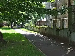 The adjoining churchyard was converted to a public park in the 1890s and is now known as St Mary's Gardens. It consists of grass with scattered trees. The grave of well-known 18th-century actress Sarah Siddons is located towards the northern end. Some headstones from the former churchyard are stacked against the west wall of the Gardens.[7]
