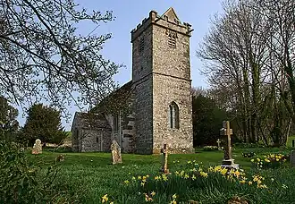 The flint chancel, dates from the 12th century, with the nave, tower and porch being built in the 14th century.[2] The 15th-century tower houses three bells, two of them medieval and one 17th century.[4] The nave roof added in the early 16th century.[1] In 1911 a major restoration of the church was undertaken.[2]