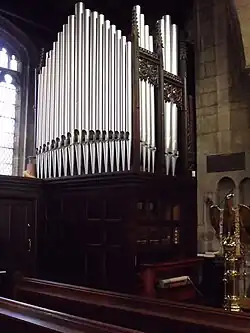 A pipe organ was built by Forster and Andrews and opened on 11 October 1859 by Henry Farmer.[15] It was modified by Wadsworth in 1892. In 1995 Norman Hall and Sons installed a second-hand organ by T.C. Lewis from St Hugh’s Church, Southwark. It comprises 2 manuals and pedals and has 15 speaking stops.[16]