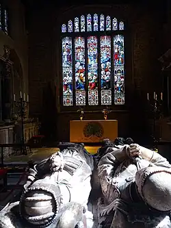 Sometimes known as the "Lady of the Vale", it is a large church which has the 2nd highest spire in Leicestershire (at 212 feet). The oldest part of the church dates from the 12th century, with additions and alterations made during the following three centuries,[3] including the nave and spire in the 15th century. There are two gargoyles on the south transept. The chancel was rebuilt in the 17th century to accommodate the monuments of the Manners family, earls (later dukes) of Rutland, which completely fill it.[4] The monuments include work by Caius Gabriel Cibber and Gerard Johnson the elder. One of the Rutland tombs is famous for its inscription, which attributes two family deaths to witchcraft by the Witches of Belvoir.[5]