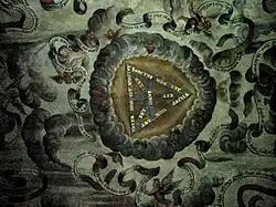 Between the nave and the north aisle is a two-bay arcade in Early English style. In the east wall of the chancel is a re-set piscina, and the south wall contains a 14th-century tomb recess. The ceiling of the chancel was painted in 1672 by Thomas Francis. It depicts the Shield of the Trinity surrounded by cherubs and texts, and angels holding a bible open at Psalm 85. The reredos consists of a triptych dating from about 1890 by the artist Charles Edgar Buckeridge. Also in the church are the Royal Arms of Charles II. The stained glass consists of a large series designed by Kempe dating from 1890 to 1922.[4] The two-manual pipe organ was built in 1866 by J. W. Walker. It was reconstructed and enlarged in 1890, and overhauled in 1991, on each occasion by Walker's.[5] There is a ring of six bells. Five of these were cast in 1737 by Abel Rudhall, and the sixth in 1890 by John Taylor and Company. The church has a Sanctus bell also made by Taylor's at about the same date.[6]