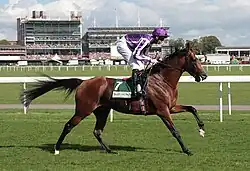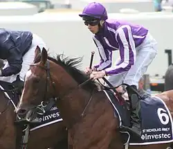 As a yearling, he was consigned by the Oaks Farm Stud to the Tattersalls sales in October 2008 where he was bought for 200,000 guineas by the bloodstock agent Demi O'Byrne on behalf of John Magnier's Coolmore organisation.[6] Like many Coolmore horse's, the details of St Nicholas Abbey's ownership have altered from race to race: he has been officially "owned" by various combinations and individuals including Derrick Smith, Susan Magnier and Michael Tabor.[7] He has been trained throughout his racing career by Aidan O'Brien at Ballydoyle. He is named after St Nicholas Abbey in Barbados.[8] He is often referred to as "St Nick".[9]