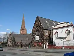 To the southwest of the church are two former schools with gables facing St Oswald's Street. That nearer the church is a simple building, in one storey, and with plain mullioned windows.[3] Beyond this is a larger former school, dating from about 1855, and possibly designed by A. W. N. Pugin. It is in sandstone with a slate roof, has two storeys, and is in a T-shaped plan, with a front of seven bays. The windows on the sides are ogee-headed lancets, and at the end facing the street is a three-light Decorated window. The school was later used as a youth centre, and is designated as a Grade II listed building.[3][6] To the south of this is a former Methodist chapel of 1845. It is a simple rectangular stuccoed brick building with round-headed windows, which has been converted for use as the parish hall.[3]