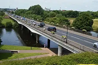 St Peter's Bridge crosses the River Trent between Burton and Stapenhill, carrying the A5189 road.[1][2] It was built between 1983 and 1985 to alleviate traffic flows on the Burton Bridge, 1.3 kilometres (0.81 mi) to the north, is crossed by around 24,000 vehicles a day.[1][2] The owner, Staffordshire County Council, originally considered it to comprise five separate structures: the western approach embankment with flood relief culverts; the western section of bridge ("Pumphouse Viaduct") over the Washlands, a flood plain; the main span across the river; the portion on the eastern bank ("Stapenhill Underpass") and a footbridge ("St Peter's Footbridge") which crosses over the structure on the Stapenhill side.[2] Since April 2009 the main bridge has been assessed as a single structure, with the footbridge and approach as ancillary structures.[1] The bridge is named for the nearby parish church of Stapenhill.[3] The structure is the newest road crossing of the Trent and one of only three to have been built since 1915 (the others being the M180 motorway and A50 road).[4]