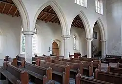 Internally, the nave measures approximately 14 metres (46 ft) by 11 metres (36 ft).[5] The roof has alternating tie beams and false hammer beams.[1] The south aisle is separated from the nave by a four-bay arcade which has octagonal piers and double chamfered arches. The aisle contains a bench sedile and a piscina.[1] The chancel measures approximately 11 metres (36 ft) by 7 metres (23 ft).[5] The south wall has three stone ogeed arches indicating the position of sedilia for the bishop, priest and deacon.[1][5] There is also an ogeed piscina; both these features of the chancel date from the 19th century.[1] To the left of the east window is a wall monument to Sir Cyril Wyche who died in 1780.[1] Sir Cyril was one of the first members of the Royal Society.[2]