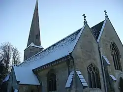 The present church, including the nave, sanctuary, south aisle, and spire, is thought to have been built by Sir John Giffard, Lord of the Manor of Leckhampton, in the 14th century.[2] He and his wife are commemorated by effigies in the church. There must have been an earlier church on the site, since in 1162 one of its priests was fined two shillings for non-payment of dues to the Canons of Cirencester Abbey by Archbishop Thomas Becket.[3]