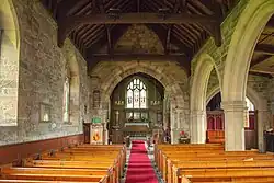 The church is built of stone with roofs of slate and lead, and consists of a nave, a south aisle, a south porch, a chancel with a south vestry, and a west tower. The tower has three stages, a plinth, diagonal buttresses, a three-light mullioned and transomed west window, bands, a clock face, two-light mullioned and transomed bell openings, and an embattled parapet with corner pinnacles. The south doorway is Norman, and has two orders of columns with scalloped capitals. Inside, there is an early 12th-century cylindrical font. The east window has stained glass by Charles Eamer Kempe. There is part of an Anglo-Danish cross shaft, and part of a hogback.[2][3]