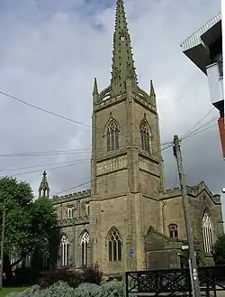 The former church is constructed in sandstone. Its architectural style is Decorated. The plan consists of a six-bay nave with a clerestory, north and south aisles, a chancel with an organ house to the north and a vestry to the south, and a southeast steeple in the angle between the aisle and the chancel. At the west end of each aisle is a tall projecting porch. Both porches have two-light windows and embattled parapets; the south porch has an arched south doorway, and the north porch has a link to a glazed extension added in the 20th century. At the west end of the nave is a small two-light window, tall embattled turrets at the corners, and a large crocketed bellcote on the apex of the gable. The clerestory has two-light square-headed windows on each side, and an embattled parapet. The windows along the sides of the aisles have two-centred arches and contain three lights, with two types of tracery. The chancel has a five-light east window, and embattled turrets at the corners. The tower is in three stages, with angle buttresses, and a stair turret at the south west corner. In the bottom stage is a three-light window, and there are bands of blind arcading in the middle stage. The bell openings each have three louvred lights. The parapet is embattled with crocketed corner pinnacles. Flying buttresses link the top of the tower to the spire, which is also crocketed; it contains lucarnes, and is topped by a weathervane.[1]