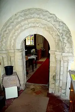 The octagonal upper section of the tower dates from about 1300, with a crenellated parapet of the 15th century, around the base of which are four projecting gargoyles that throw rainwater clear of the walls. The 12th-century north door, now within the 19th-century vestry, has a chevroned arch in two orders, and two orders of colonettes. The south porch, with flushwork decoration, was built about 1470.[2][3]