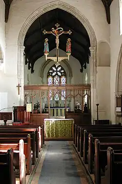 The 14th-century south arcade has four bays, with alternating foiled and octagonal piers. The octagonal font, carved with blind tracery and with crocketted finials, is of the 15th century. There is a medieval piscina in the south aisle, and a later piscina in the chancel.[2][3][4]