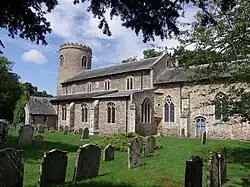 The earliest part of the church is the banding of carstone at the base of the tower, which probably predates the Norman conquest. The rest of the tower dates from the late 11th or early 12th century, with the upper part dating from the 14th century, with four bell-openings, each of two lights, and a post-medieval crenellated parapet. Most of the rest of the building is of the 14th and 15th centuries. There is a nave with a south aisle and four clerestory windows, and a chancel. There is a late-medieval south porch.[2][3][4]