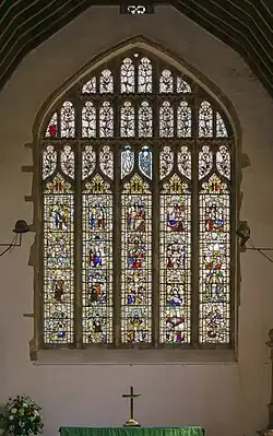 The mediaeval stained glass east window dates largely from the middle fifteenth century, with the top lights containing foliage patterns from the nineteenth century. Twenty main panels in total with 16 depicting scenes from the Joyful, Sorrowful and Glorious Mysteries of Mary, two contain fragments, and two depict donors.