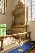 The high altar at the eastern end of the chancel is flanked by two tombs. Parishioners lining up at the communion rail may examine the fine mediaeval stained glass in the east window. To the north of the chancel, is St Anne's Chapel and the Jesus Chapel. The latter once formed the ground floor of a two-storey sacristy and was formerly used as the parish schoolroom. This chapel for small services has its own communion rail, carved wooden altar and two chairs.