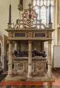 - In the Lady Chapel, is the elaborate tomb of yet another Sir Thomas Lovell (died 1604) and Dame Alice (died 1602). Painted and gilded effigies lie atop the tomb-chest, their hands clasped in prayer. Sir Thomas's head rests on his helmet, which is identical to a helmet that hangs on the wall above the tomb, and at his feet is a peacock's feathers. Alice's head lies on a cushion and at her feet is a Saracen's scalp, held up by a pair of arms. The canopy is supported by three Corinthian columns and topped with three black obelisks. Many coats of arms feature in the canopy and face of the tomb-chest.