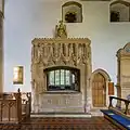 In the centre of the west end of the nave is a large mediaeval octagonal stone font, with fine carvings and a dark wood cover that dates from the 1600s. Nearby are a stone holy water stoup and on the wall a medallion of Sir Thomas Lovell (died 1524), who was Chancellor of the Exchequer to Henry VII and Henry VIII and who built East Harling Manor. The medallion is a plaster replica of a bronze bust (in Westminster Abbey) by Pietro Torrigiano. Also in this area, at the back of the seating, are two sections of mediaeval screenwork. The panels came from the lower wall and gates of a rood screen, and were moved here in 1973. The woodwork, with green, red and gold, is intricately carved with Biblical scenes and the Herling unicorn.